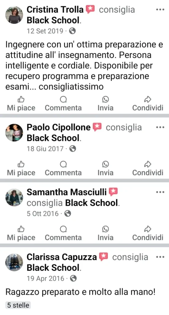 Affidarsi a BlackSchool significa scegliere un percorso di preparazione mirato ed efficace. Gli studenti del 5° anno, spesso sopraffatti dalla complessità della matematica, possono trovare nel mio corso la guida necessaria per affrontare l’Esame di Stato con serenità.